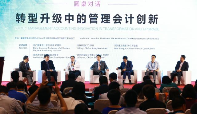 由IMA 亞太區(qū)總監(jiān)兼中國區(qū)首席代表白俊江主持的“轉(zhuǎn)型升級中的管理會計創(chuàng)新”圓桌對話,廈門國家會計學(xué)院教授鄧建平,吉祥航空CFO李兵,武漢建工集團(tuán)CFO萬建國,票市通創(chuàng)始人、總裁敖維平,北京汽車股份有限公司CFO李德仁共同參與并結(jié)合自己所在企業(yè)的情況發(fā)表了獨(dú)到的見解。